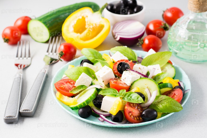 Свежий домашний греческий салат с листьями базилика на тарелке и ингредиентами для приготовления пищи на столе. Домашняя жизнь