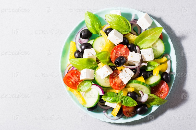 Свежий домашний греческий салат с листьями базилика на тарелке на столе. Домашняя жизнь. Вид сверху. Скопируйте пространство. Вид сверху