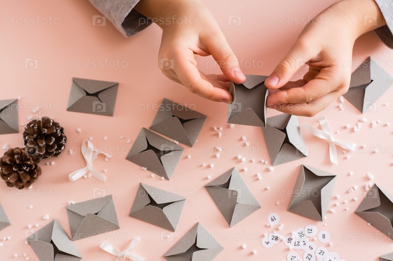 Детские руки делают конверты из серого картона для адвент-календаря на столе в рождественских украшениях