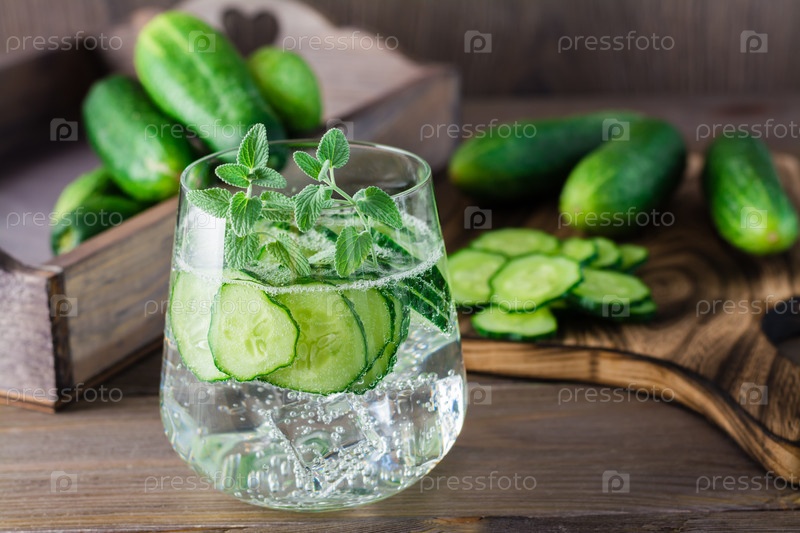 Детокс напиток. Вода с кусочками огурца, льдом и листьями мяты в прозрачном стакане и разделочная доска с овощами на деревянном столе