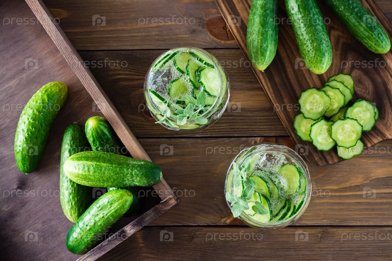 Детокс напиток. Вода с кусочками огурца, льдом и листьями мяты в прозрачных стаканах на деревянном столе. Вид сверху