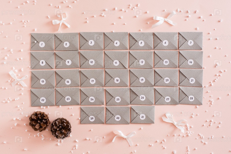 Готовый адвент-календарь из серых картонных конвертов на столе в елочных украшениях. Вид сверху