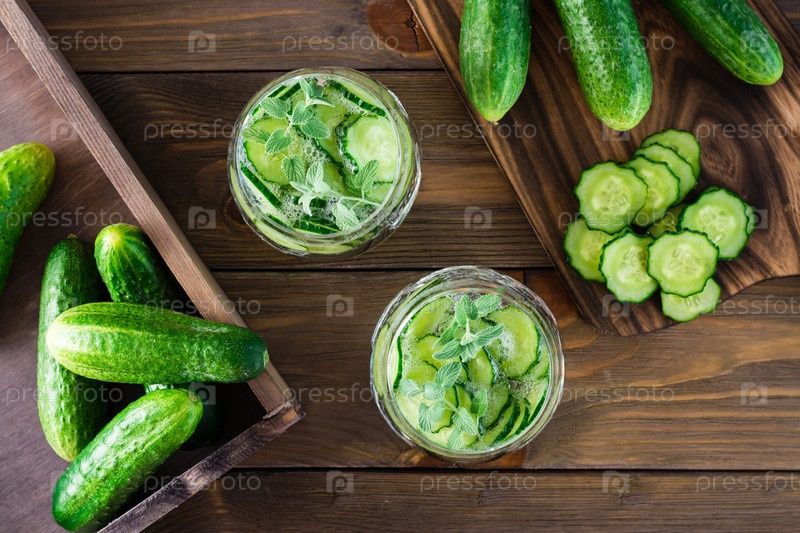 Детокс напиток. Вода с кусочками огурца, льдом и листьями мяты в прозрачном стакане и разделочная доска с овощами на деревянном столе. Вид сверху