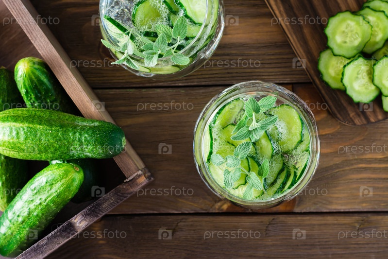 Детокс напиток. Вода с кусочками огурца и льдом в прозрачном стакане на деревянном столе. Вид сверху