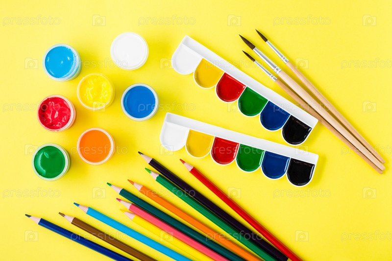 Инструменты рисования. Гуашь, акварель, карандаши и кисти на желтом фоне. Творческий досуг