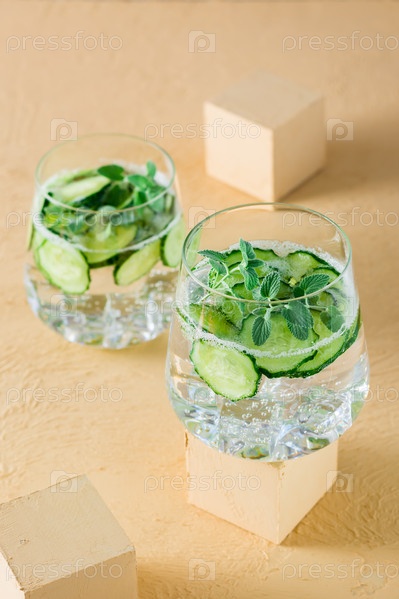Детокс напиток. Вода с огурцом и мятой в прозрачном стакане на кубической подставке. Вертикальный вид