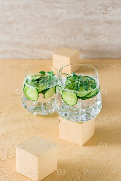 Детокс напиток. Вода с огурцом и мятой в прозрачном стакане на кубической подставке