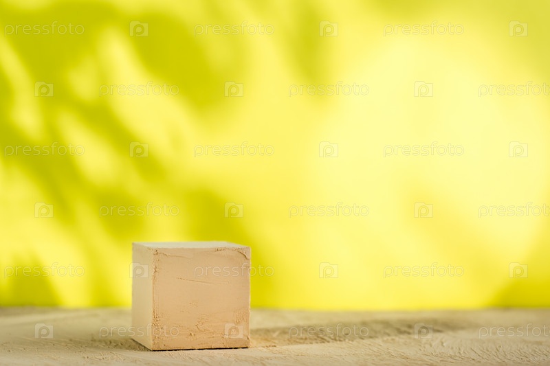 Макет. Текстурированный куб бежевой поверхности на желтом фоне с тенями от растений. Копировать пространство