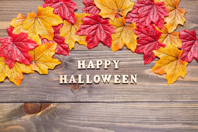 Открытка на Хэллоуин. Надпись на деревянном фоне в окружении кленовых листьев. Копировать пространство