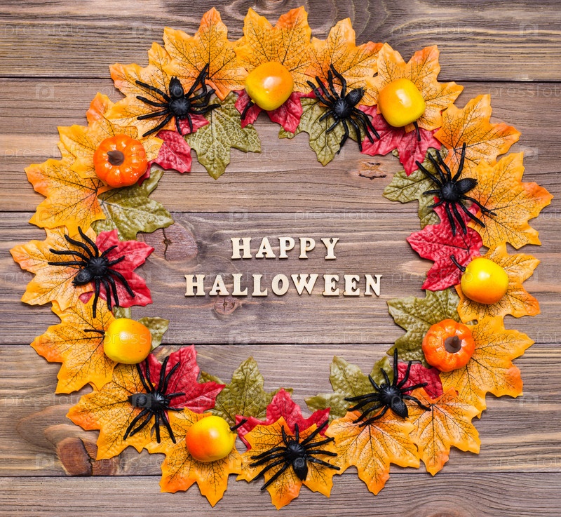 Хэллоуин счастливые поздравления. Фразы в окружении кленовых листьев, пауков, тыкв и яблок на деревянном фоне