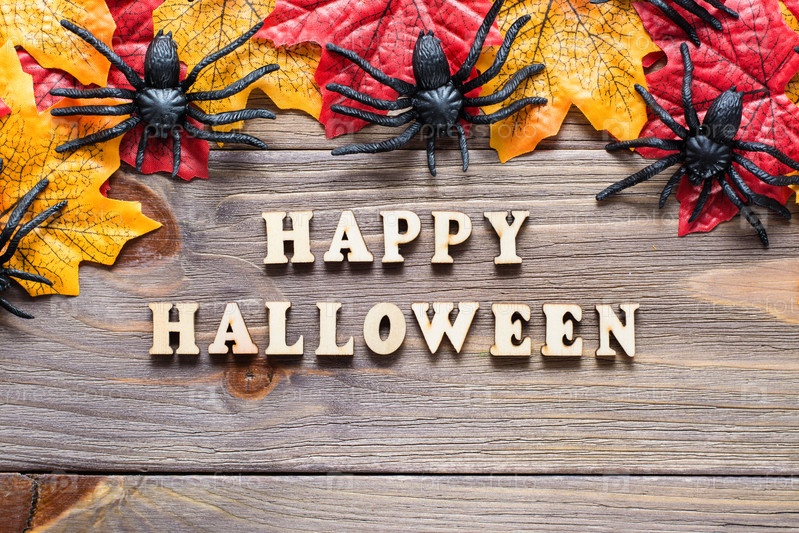 Хэллоуин счастливые поздравления. Фраза в окружении кленовых листьев и пауков на деревянном фоне