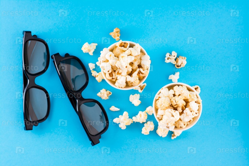 сладкая фаст-фуд. карамельные попкорны в бумажных стаканах и 3D-очки на синем фоне. вид сверху