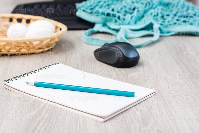 Концепция онлайн-покупки продуктов, не выходя из дома. Блокнот для списка покупок на фоне корзины с яйцами, клавиатуры и авоськи на столе