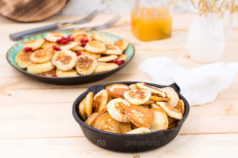 Трендовый завтрак. Голландские мини-блины на сковороде и на тарелке с красной смородиной на деревянном столе