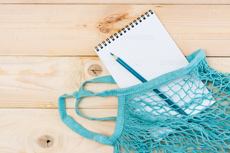 Концепция онлайн-покупок, не выходя из дома. Блокнот для списка покупок в авоське на деревянном столе. Вид сверху