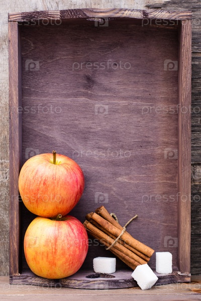 Ингредиенты для приготовления успокаивающего чая с яблоком и корицей в подносе на деревянном столе. Концепция детоксикации, антидепрессант. Красивый натюрморт
