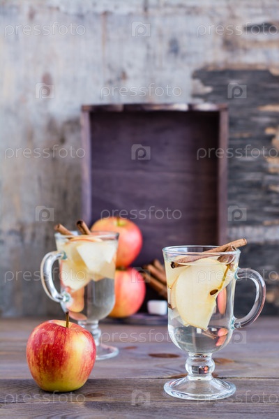 Теплый успокаивающий чай из яблок и корицы в стаканах и ингредиенты для приготовления пищи на деревянном столе. Концепция детоксикации, антидепрессант. Красивый натюрморт