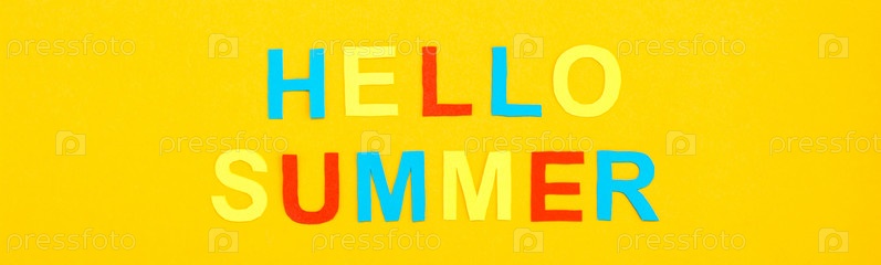 Привет лето. Надпись цветными резными буквами на желтом картоне. Вид сверху. Веб-баннер