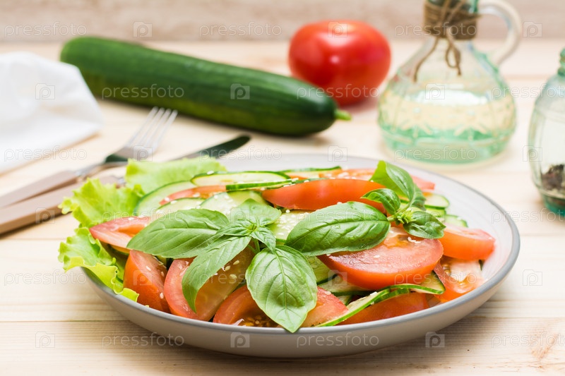 Традиционный салат из ломтиков огурца, помидоров и семян кунжута на тарелке и ингредиентов для приготовления пищи на деревянном столе. Вегетарианская еда
