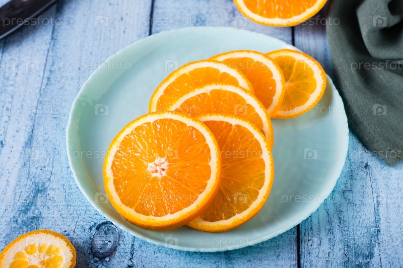 Свежий сочный нарезанный апельсин на тарелке на столе. Здоровая пища