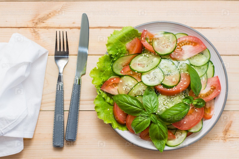 Традиционный салат из ломтиков огурца, помидоров и семян кунжута на тарелке и столовых приборов на деревянном столе. Вегетарианская еда. Вид сверху