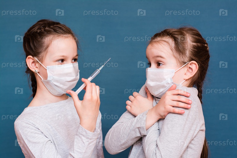 Девушки в медицинских масках смотрят на шприц с лекарством в руке. Вакцинация, лечение детей. Предотвращение вспышек
