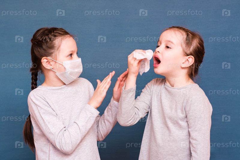 Девушка чихает, прячась за платком. Вторая девушка защищается от нее маской и руками. Заражение детей
