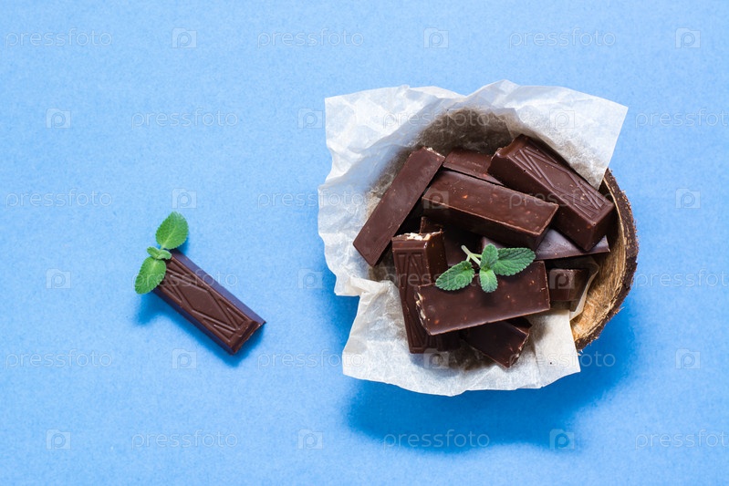 Кусочки шоколада и листья мяты в миске и на синем бумажном фоне. Концепция избыточного веса от сладостей. Вид сверху