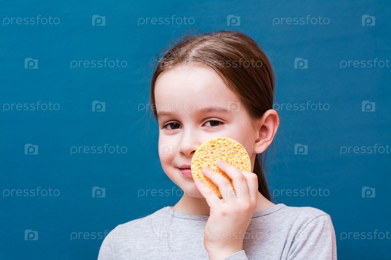 Веселая милая девушка моет лицо косметической губкой на синем фоне. Концепция детской гигиены