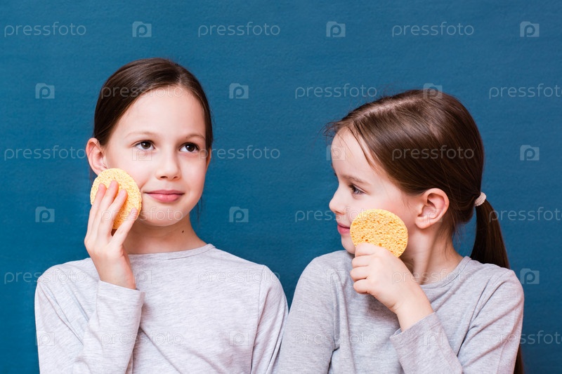 Две девушки моются губками для лица на синем фоне. Концепция детской гигиены