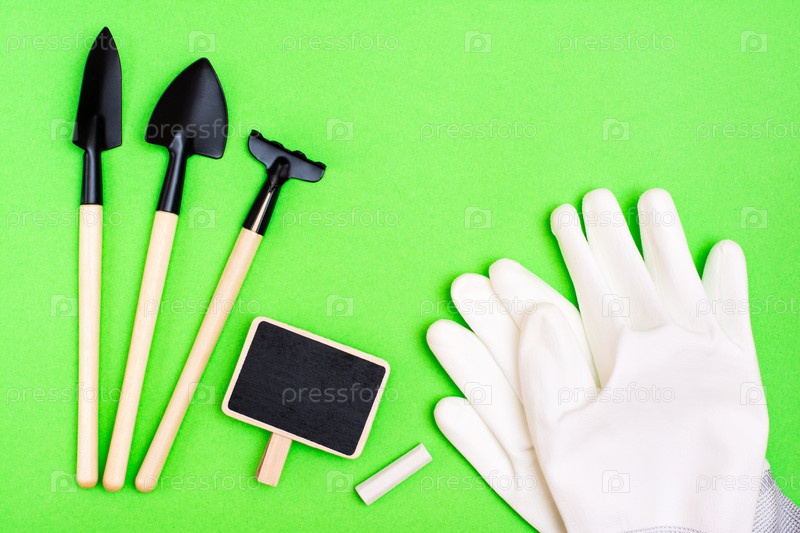 Домашнее садоводство. Миниатюрные садовые инструменты: совок, грабли, доска для надписей и мел, садовые перчатки на зеленом картоне. Вид сверху