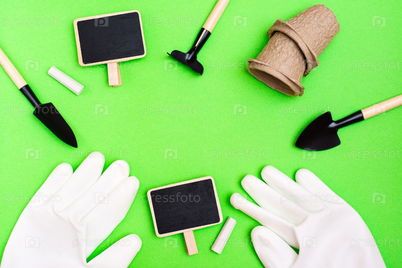 Домашнее садоводство. На зеленом картоне обрамлены миниатюрные садовые инструменты: совок, грабли, доска для письма, перчатки и мел. Вид сверху