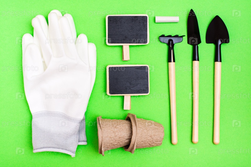 Домашнее садоводство. Миниатюрные садовые инструменты: совок, грабли, доска для надписей, перчатки и мел на зеленом картоне. Вид сверху