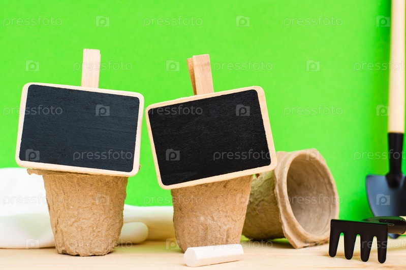 Домашнее садоводство. Доски для надписей растений на бумажных горшках для посадки, миниатюрные садовые инструменты и перчатки на деревянном столе на зеленом фоне. Крупный план