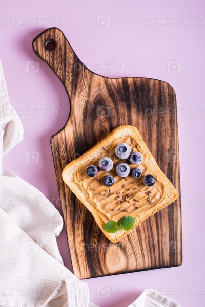 Тост с арахисовым маслом с черникой, семенами льна и мятой на разделочной доске. Вид сверху и вертикальный