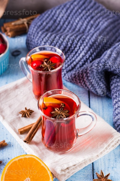 Домашний горячий глинтвейн с апельсином, корицей и ягодами в стаканах на столе. Вертикальный вид