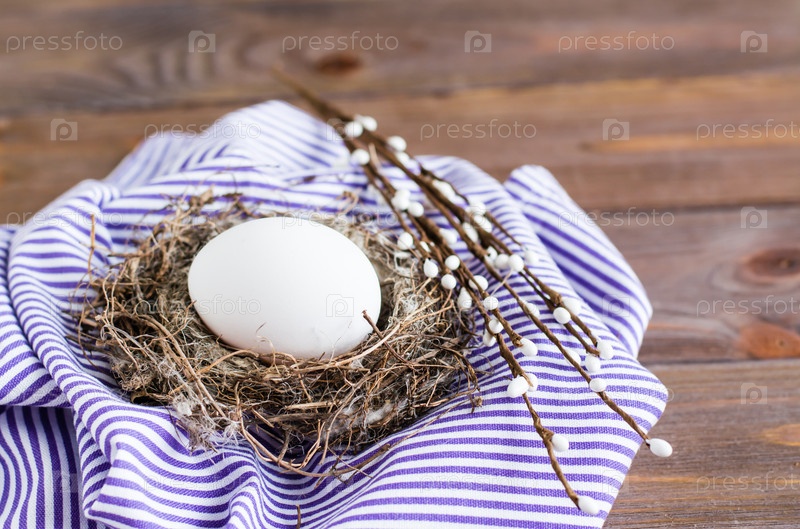 Счастливой Пасхи. Одно белое куриное яйцо в птичьем гнезде и ветки ивы на деревянном столе. Деревенский стиль. Копировать пространство