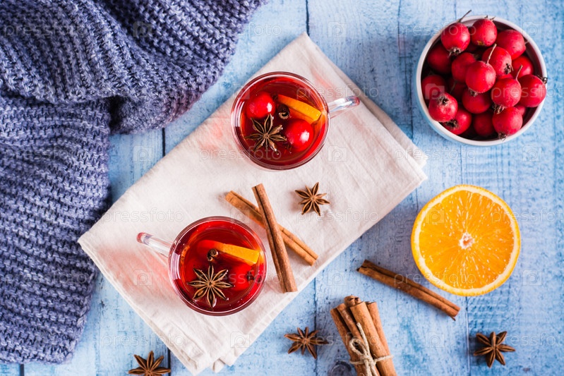 Глинтвейн с корицей, апельсином и ягодами в стаканах. Зимние домашние напитки. Вид сверху