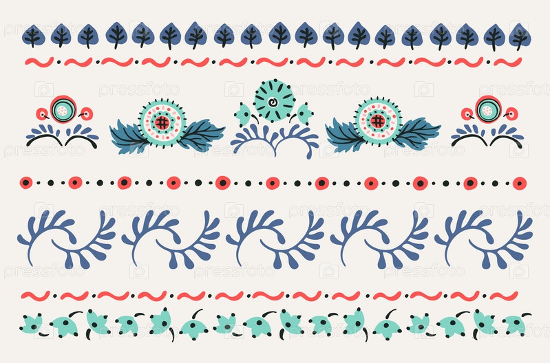 Набор этнических элементов. Бордюр представляет собой полосу с цветами, листьями, ветками, вензелями. Народная вышивка. Славянский, украинский, русский мотив. Хохлома, матрешка, дымковская игрушка. Мексиканский, индийский, цыганский ковер. Вязаное кружево