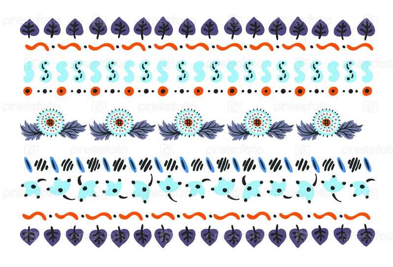 Набор этнических элементов. Бордюр представляет собой полосу с цветами, листьями, ветками, вензелями. Народная вышивка. Славянский, украинский, русский мотив. Хохлома, матрешка, дымковская игрушка. Мексиканский, индийский, цыганский ковер. Вязаное кружево