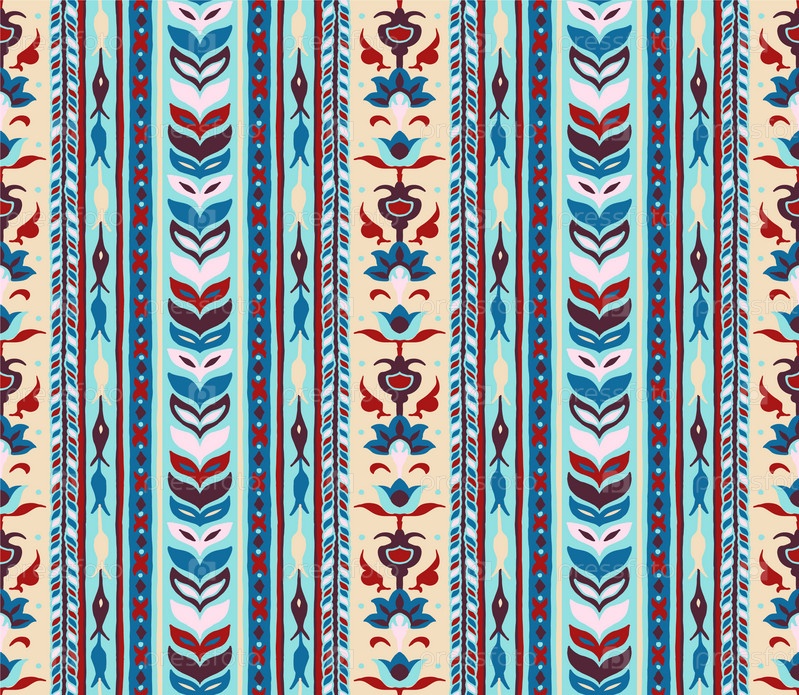 Геометрический дамасский орнамент. Икат границы. Этническая вышивка с листьями и монограммами. Племенная векторная текстура. Бесшовный народный узор в ацтекском стиле. Индийский, скандинавский, цыганский, мексиканский, африканский ковер