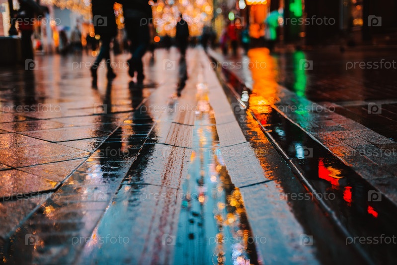 Дождливая ночь в большом городе, отблески огней на мокрой поверхности дороги