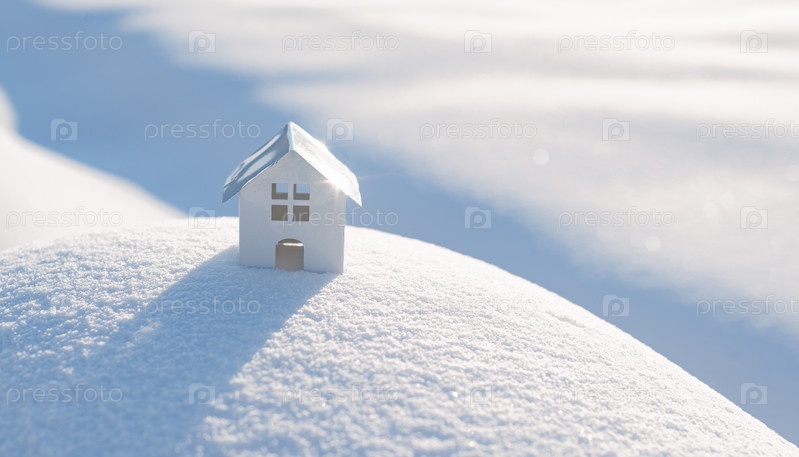 Декоративный белый дом с елью в снегу при солнечном свете на открытом воздухе, свободное пространство, реклама нового дома и Рождество