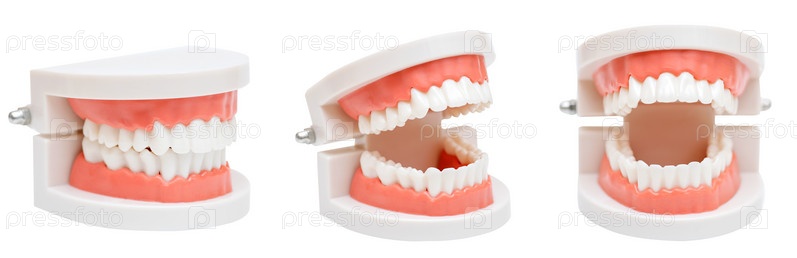 Стоматологическая модель челюсти в разных положениях на белом фоне. Гигиена полости рта