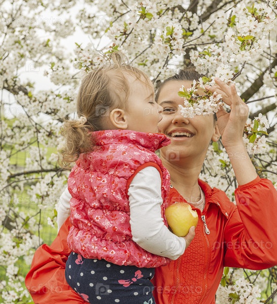 Девушка держит ребенка на руках и показывает ему цветы