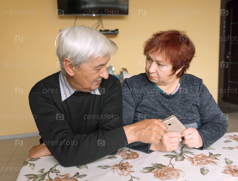 Пожилой мужчина и женщина сидят за столом с телефоном