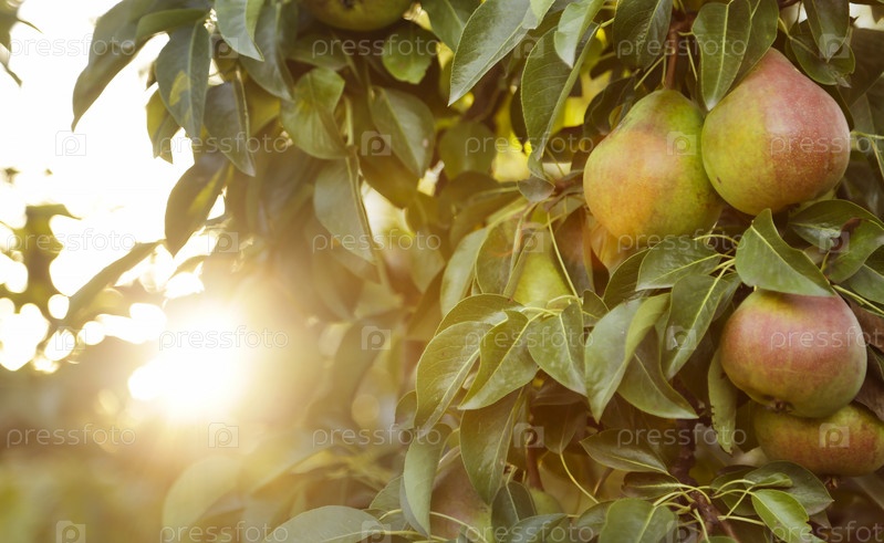 Спелые сочные плоды груши висят на дереве в саду в лучах заходящего солнца