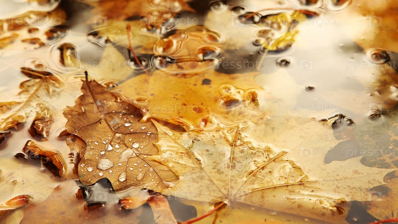 Желтый дубовый и кленовый лист, покрытый большими каплями воды, лежит в воде в осенний день