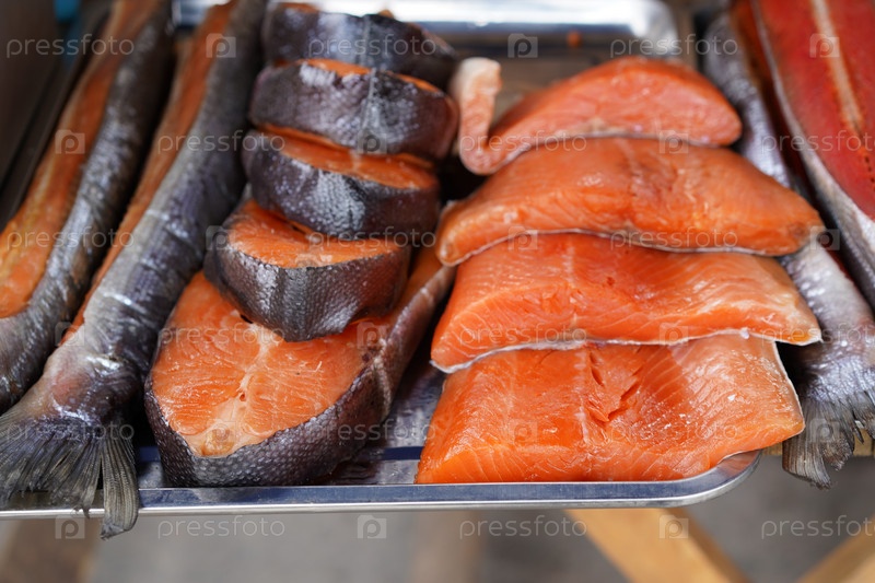 Копченая красная рыба на металлическом подносе