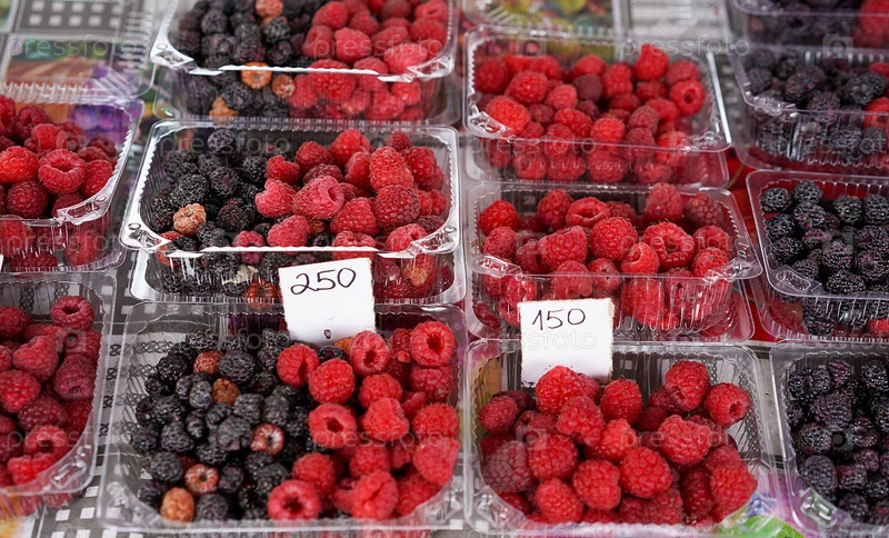 Красная и черная малина в пластиковых контейнерах с ценниками